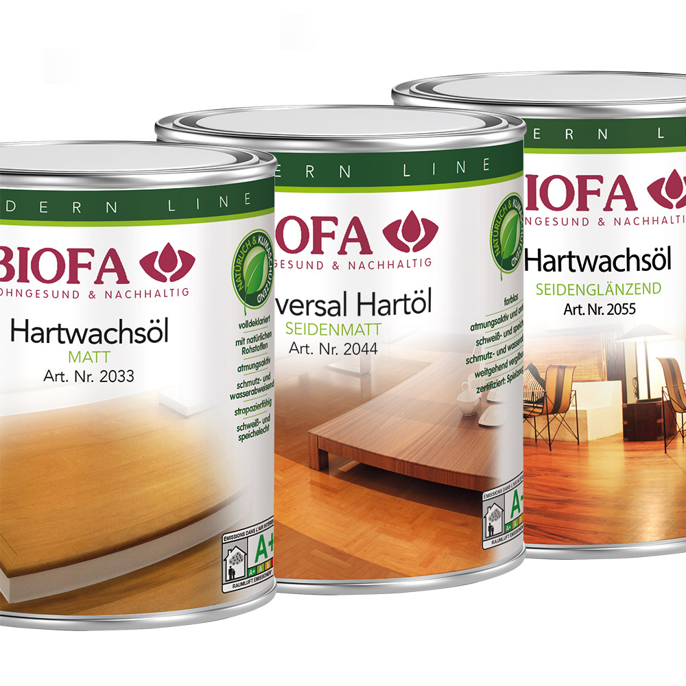 Die farblosen BIOFA-Öle Hartwachsöl matt 2033, Universal Hartöl 2044 seidenmatt und Hartwachsöl 2055 seidenglänzend erhalten den natürlichen Charakter des Holzes und sind sehr leicht zu verarbeiten. Die mit dem Öl behandelten Oberflächen sind offenporig, strapazierfähig, schweiß- und speichelecht sowie vergilbungsarm. Sie unterscheiden sich im Wesentlichen nur im Glanzgrad.