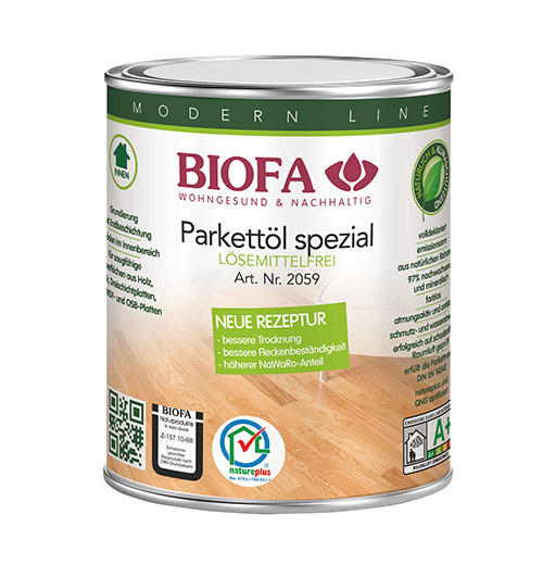 Das farblose, lösemittelfreie BIOFA Parkettöl spezial 2059 wurde erfolgreich auf schadstoffarmes Raumklima geprüft, ist natureplus zertifiziert und erfüllt die Anforderungen der Parkettnorm DIN EN 14342. Es verleiht der Oberfläche Tiefe und eine angenehme Haptik. Die mit dem Öl behandelten Oberflächen sind seidenmatt, strapazierfähig, schmutz- und wasserabweisend und sie sind absolut leicht zu pflegen und zu renovieren.