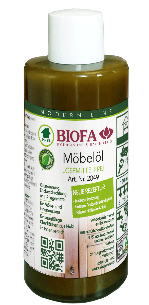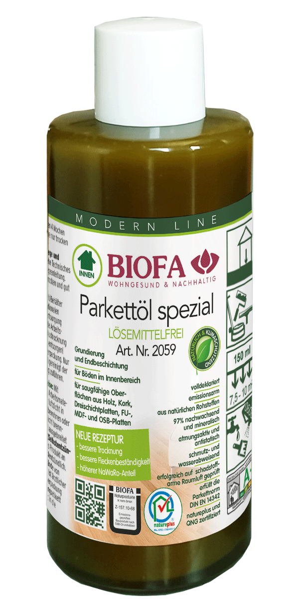 Und worauf wir besonders stolz sind: BIOFA Parkettöl spezial 2059 ist das einzige natureplus zertifizierte Fußbodenöl auf dem Markt!.