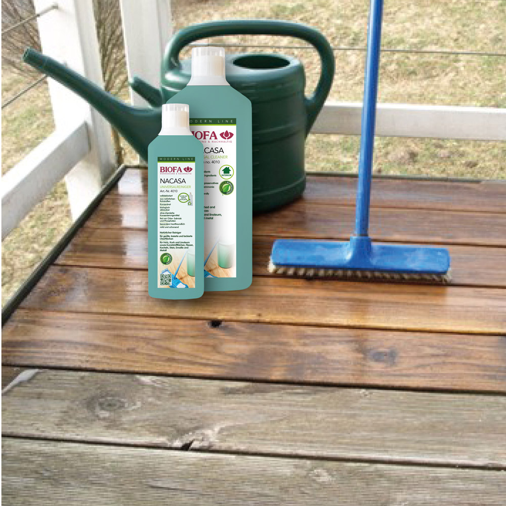 Neben der schonend milden Reinigung sämtlicher Oberflächen im Haushalt bewährt sich das NACASA Universalreiniger Konzentrat auch für stark bewitterte Oberflächen im Außenbereich. Grünbeläge sowie Algen oder Schimmelbefall, gegen die meist besonders starke und biozidhaltige Reinigungsmittel verwendet werden, entfernt NACASA schon durch eine kleine Beigabe von Haushaltsessig. Diese "biozidfreie" und dennoch wirksame Methode belastet umliegende Gartenflächen, Pflanzen und Gewässer nicht.