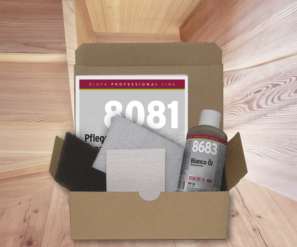Dafür haben wir, analog zum BIOFA Pflegeset 2081 für lösemittelfrei geölte Holzoberflächen, das BIOFA Pflegeset Bianco 8081 für mit BIOFA Bianco Öl 8683 behandelte Holzoberflächen in unser Programm aufgenommen.