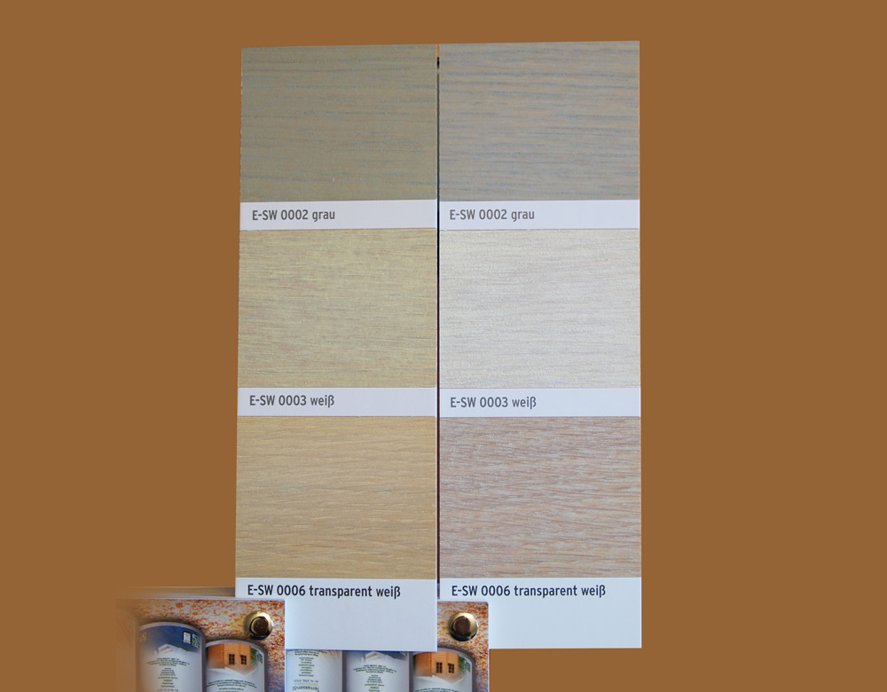 Wohingegen sich die beiden ersten Fächer MURIC und SILIC nur für deckende Produkte eignen, sie decken unsere Wand- und Fassadenfarben ab, bedienen die beiden neuen Fächer FILUC und ELUC unsere transparenten Produkte. Im FILUC-Fächer finden Sie alle Farbtöne, in denen wir unsere transparenten, wässrigen Produkte abtönen können - lösemittelfreie Holzlasuren und Colorwachs - und im ELUC-Fächer finden Sie alle Farbtöne, in denen wir unsere transparenten, öligen Produkte abtönen können - Coloröl, Wetterschutzöl, Terrassenöl und die lösemittelhaltigen Holzlasuren.
