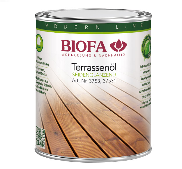 BIOFA Terrassenöl ist eine hochwertige Öl-Harzbeschichtung aus natürlichen Rohstoffen für Terrassenhölzer im Außenbereich wie z. B. Lärche, Douglasie, Robinie, Eiche, Bangkirai, etc. Hochwertige pflanzliche Öle imprägnieren neues, unbehandeltes Holz. Ältere und bereits geölte Hölzer werden wieder aufgefrischt. Terrassenöl lässt sich schnell und leicht verarbeiten. Die natürlichen Öle dringen tief in das Holz ein und schützen es vor Feuchtigkeit. Bei neuen Terrassendielen wird eine beidseitige Behandlung vor dem Verlegen vorgenommen. Terrassendielen müssen grundsätzlich einen Neigungswinkel (Ablaufwinkel) von mind. 2-3% aufweisen, um länger stehendes Wasser zu vermeiden.