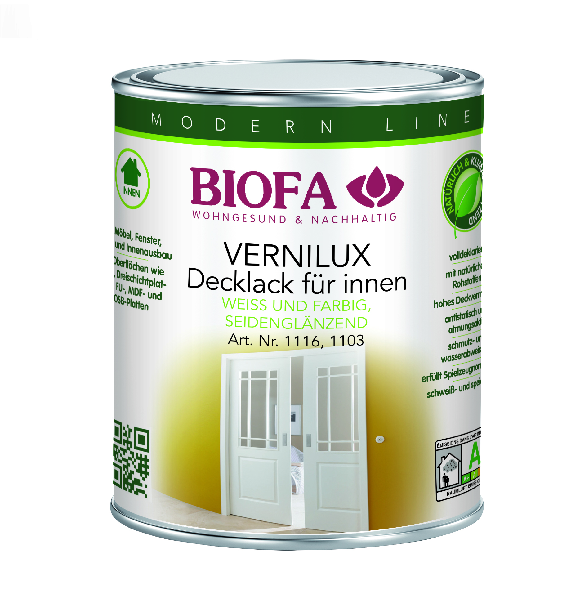 Hergestellt wird der BIOFA Vernilux Decklack aus natürlichen Baumharzen, Ölen und Pigmenten, in weiß (1115), farbig (1101), seidenglänzend und seidenmatt. Durch seine natürliche Zusammensetzung aus Ölen und Naturharzen hat der Holzlack eine gute Haftung, ist nach dem Auftrocknen sehr widerstandsfähig, atmungsaktiv und er bleibt elastisch. Für unbehandelte Holzuntergründe und stark saugende Hölzer empfehlen wir eine Grundierung mit der BIOFA Vorstreichfarbe 1210. Ebenfalls ideal ist der Vernilux Decklack für Metalloberflächen, nach einer Grundierung mit geeigneter Rostschutzfarbe.
