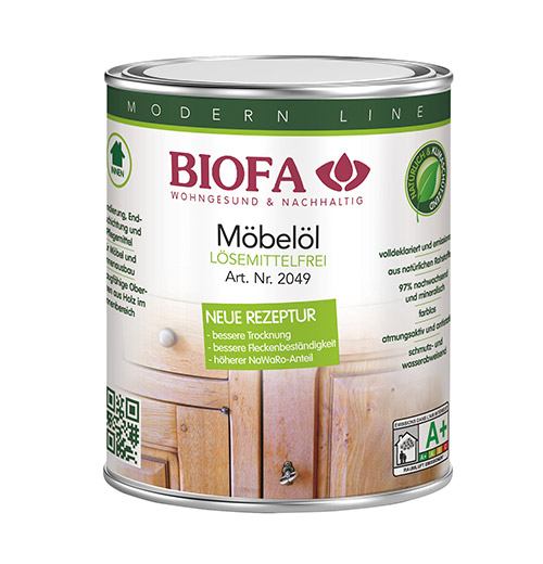 BIOFA Möbelöl ist eine Grundierung und Endbeschichtung sowie ein Pflegemittel für Möbel, Innenausbau und Spielzeug. Es eignet sich für alle saugfähigen Oberflächen aus Holz.