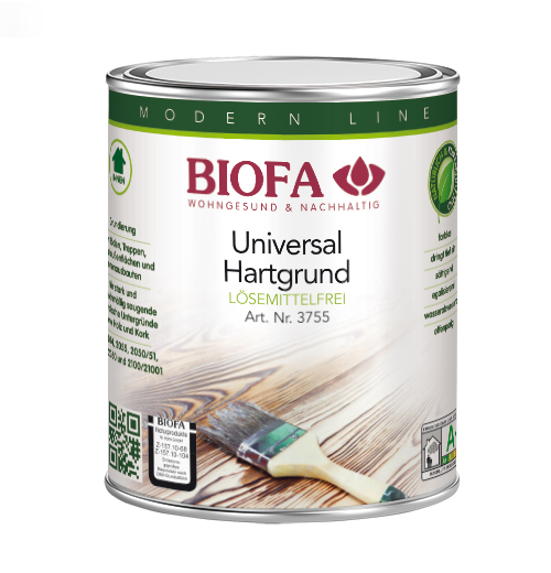BIOFA-Universal-Hartgrund lösemittelfrei 3755 ist ein farbloses, natürliches Öl zur Grundierung für Holz- und Korkböden, Treppen, Möbeloberflächen, Innenausbauten und mineralische Untergründe, wie z. B. Cotto-Fliesen und stark saugende, verfugte Steinfliesen im Innenbereich.