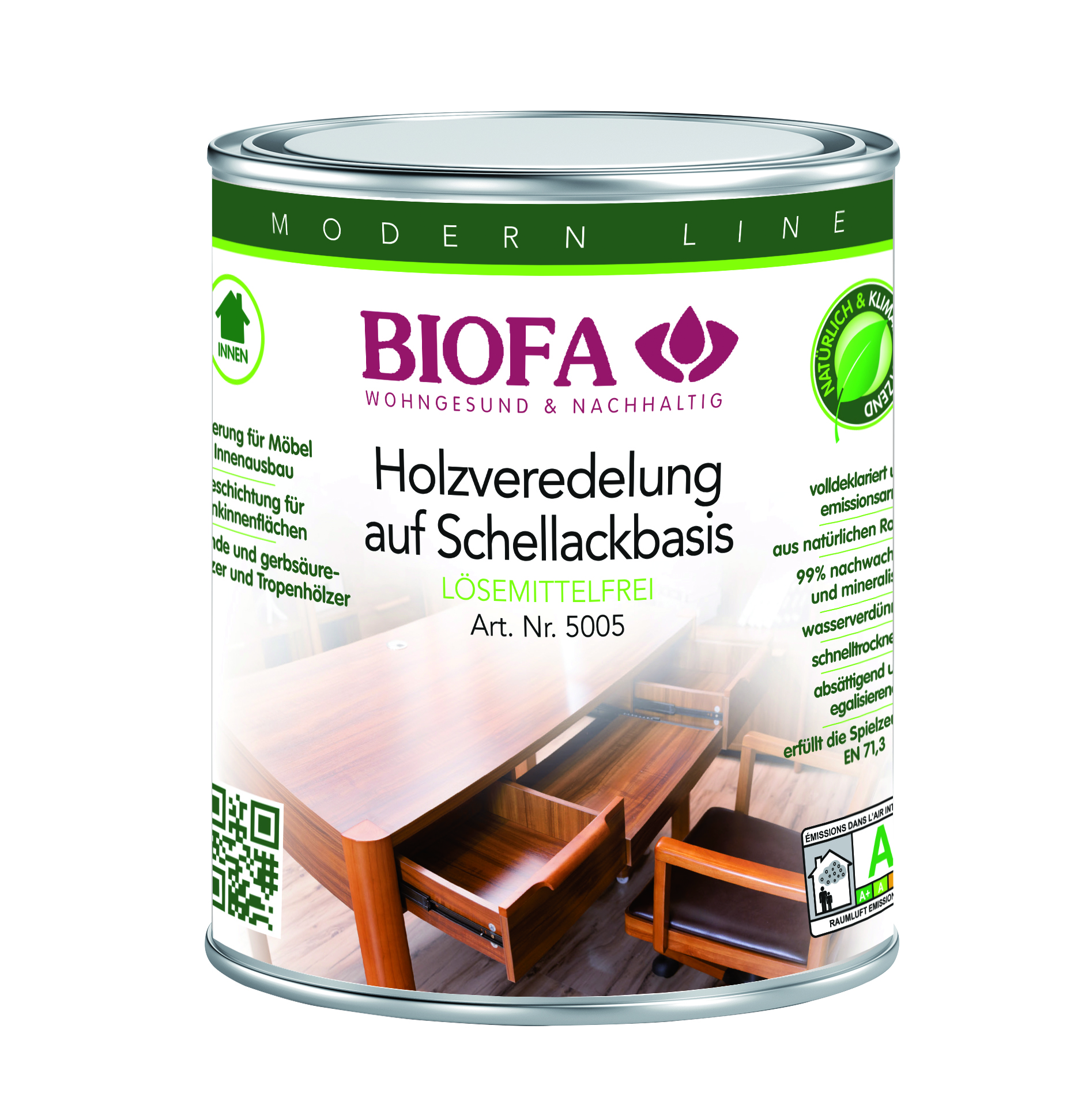 Der BIOFA Vernilux Decklack für innen ist ein gut deckender, schmutz- und wasserabweisender Naturharzlack für Holz im Innenbereich.